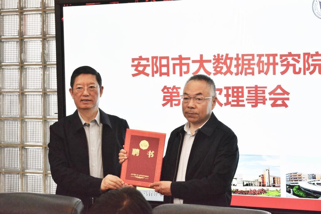 会议审议通过了理事会章程、理事会成员名单、学术委员会成员名单,董事长景国勋当选第一届理事会理事长。会议还宣布了研究院经理、副经理人选。计算机公司副经理孙高飞被聘为研究院经理,安阳市大数据局副局长靳水成和计算机公司教师许研、韩毅被聘为研究院副经理。景国勋先后为理事会成员、学术委员会成员、经理、副经理颁发聘书。随后,与会人员围绕研究院下一步的工作安排进行了讨论交流。