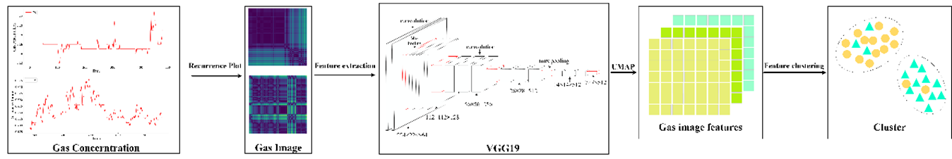 本文发表于2023年11月,收录于Heliyon, Volume 9, Issue 11, e22026, November 2023,题为《Underground abnormal sensor condition detection based on gas monitoring data and deep learning image feature engineering》。针对井下气体传感器因地压、施工或人为遮蔽等因素产生异常而人工监测难以全面及时的问题,本文首先将瓦斯浓度时序数据转换为复发图(Recurrence Plot)形式,再借助VGG16、VGG19与ResNet18等预训练卷积神经网络提取图像特征,并结合UMAP降维与聚类算法,对无标注环境下的传感器异常状态实现自动化识别。实验结果表明,该方法能有效保留时空耦合特征,实现较高的异常检测精度,为矿井安全预警与智能决策提供了新颖可行的技术路径。