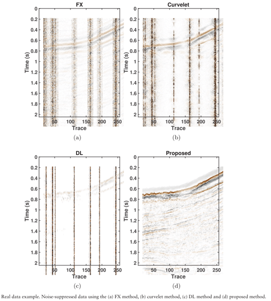公司冯振杰博士2022年在《Geophysical Prospecting》发表论文和《Robust fast dictionary learning for seismic noise attenuation》,该论文提出了一种新颖的鲁棒性字典学习方法来处理随机噪声和不规则噪声,将基于字典学习的去噪问题构建为一个迭代过程,在每次迭代中,逐步减小不规则噪声的影响,使去噪问题更接近高斯类型。实验表明,该方法去噪效果良好,主要结果如下图所示。