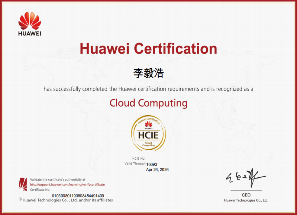 公司员工李毅浩考取华为HCIE-云计算方向认证
