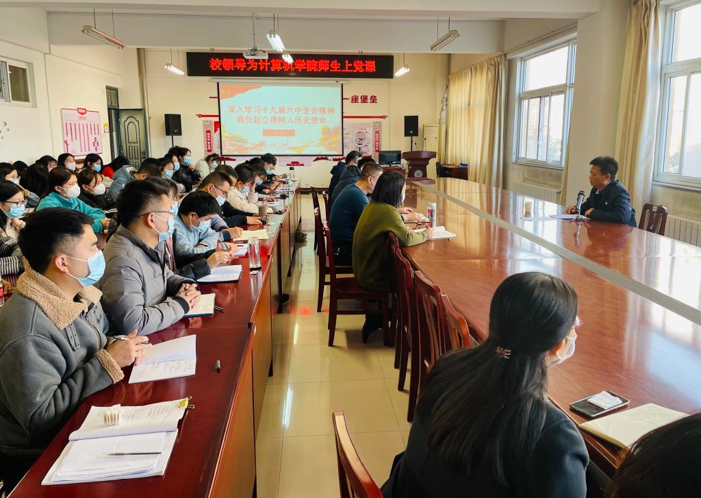 11月24日下午,副董事长蒋文龙以《深入学习党的十九届六中全会精神 肩负起立德树人光荣使命》为题,为计算机公司80多名师生党员讲党课。
